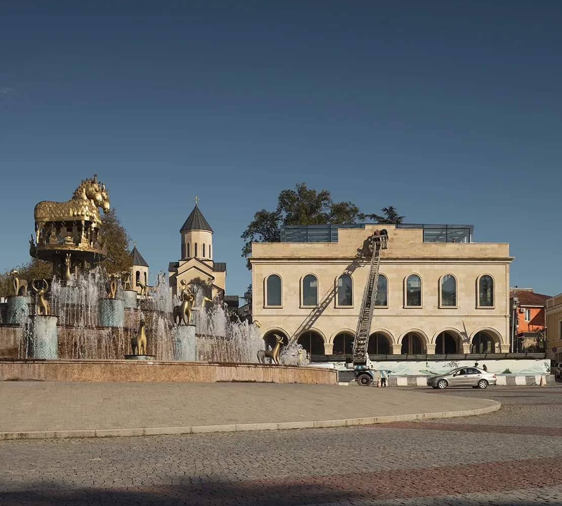მთავარი ფასადის სახასიათო ელემენტია წრიული ფორმის ციფრული ეკრანი, რომელიც საათის, საინფორმაციო დაფისა თუ დეკორაციის ფუნქციას ითავსებს და რიგით გამვლელს არქიტექტურასთან აკავშირებს. აღნიშნული გადაწყვეტილებების შედეგად, ისტორიული ფასადისა და თანამედროვე დიზაინის ჰარმონიულ მთლიანობა მივიღეთ, რომელიც ორგანულად ჩაეწერა მოედნის კომპოზიციურ წყობასა და არსებული შენობების სტილისტიკაში.